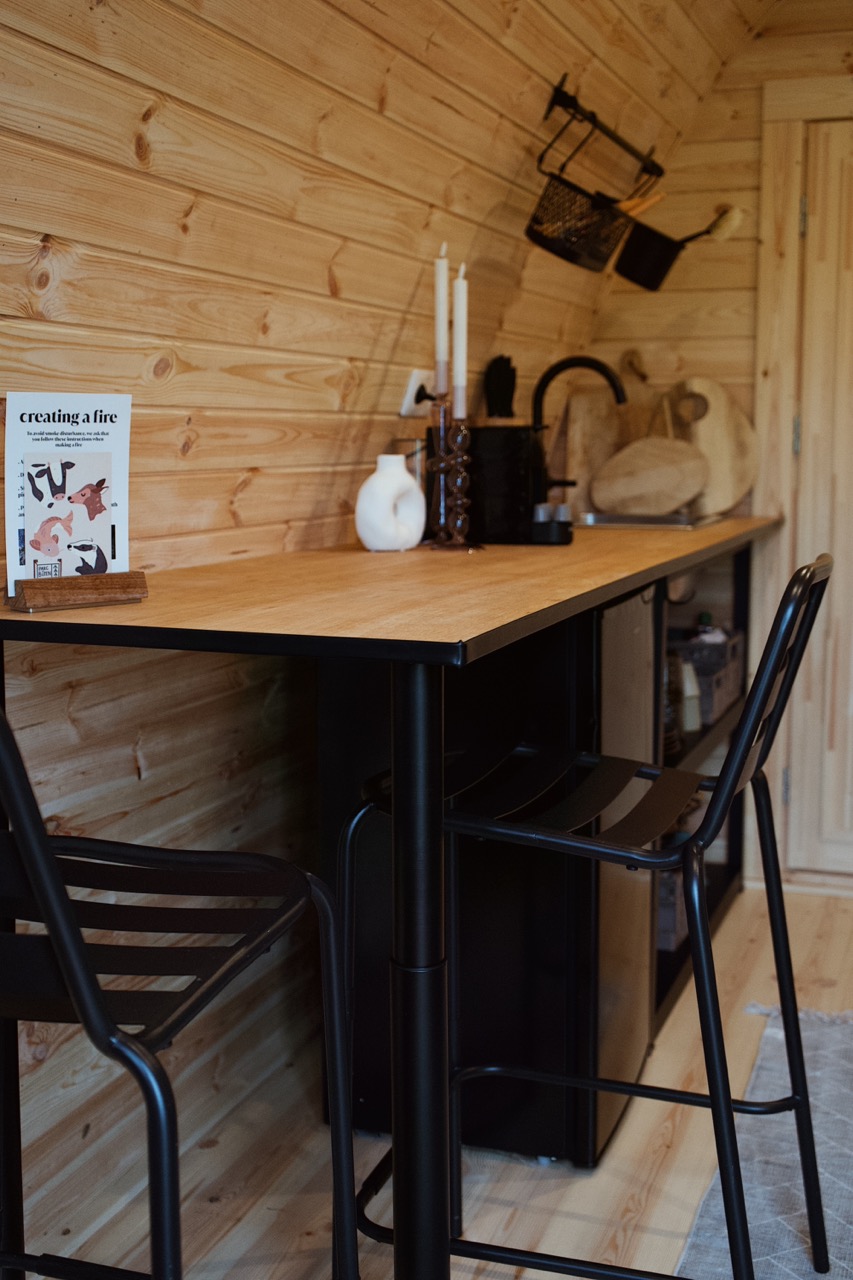 De Glamping Pods hebben een eigen koelkast en klein keukentje met gootsteen. Binnen koken is helaas niet toegestaan.